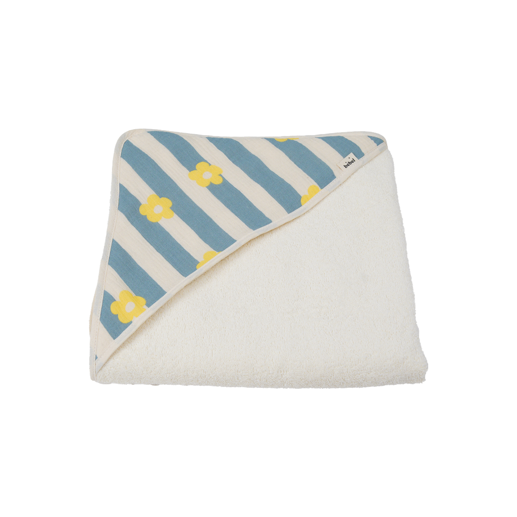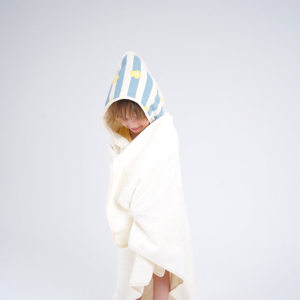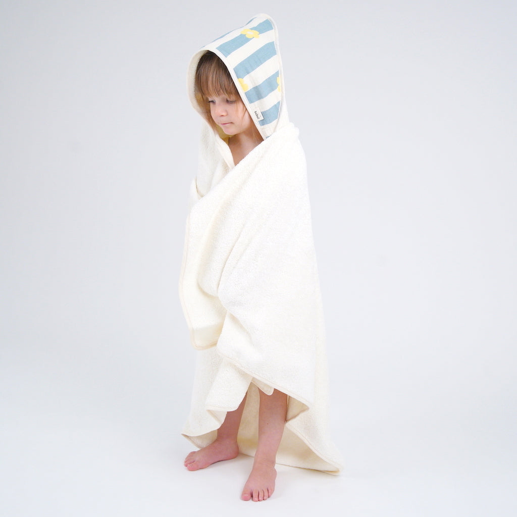 La cape de bain Bebel en éponge et double gaze Oeko-Tex se veut simple et fonctionnel.