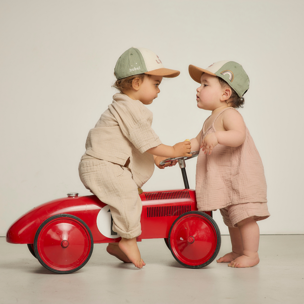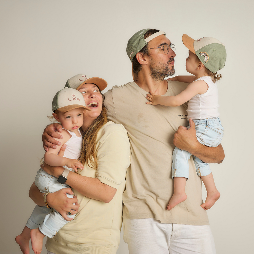 bebel s'associe à LXH pour une collab exclusive : une édition limitée de casquettes matchy-matchy adulte et bébé.